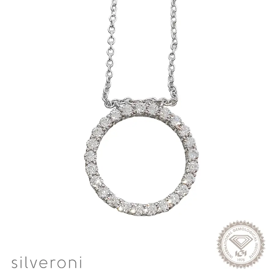 The Eternal Circle Lab Grown Diamond Necklace represents everlasting unity — a perfect circle of light designed to shine with purpose. Crafted by Silveroni’s artisans, this timeless pendant features 25 brilliant 2.2 mm round-cut lab-grown diamonds, totaling 1.00 carat, perfectly aligned on a graceful 18K ethical white gold frame. Suspended from a fine chain, it glimmers with quiet luxury and modern elegance.