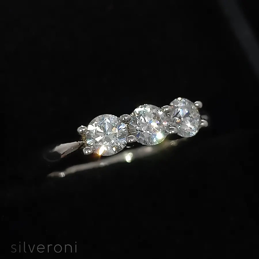 Jewelers across the industry embrace lab-grown diamonds because they deliver complete physical and chemical properties and optical performance like natural diamonds with dramatically lower environmental impact. The Ethereal Shine Ring contains three round-cut lab grown diamonds which measure 4.0mm each while adding up to 0.75 carats. The ring features diamond stones with superior clarity and exceptional brilliance.