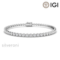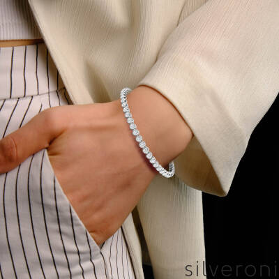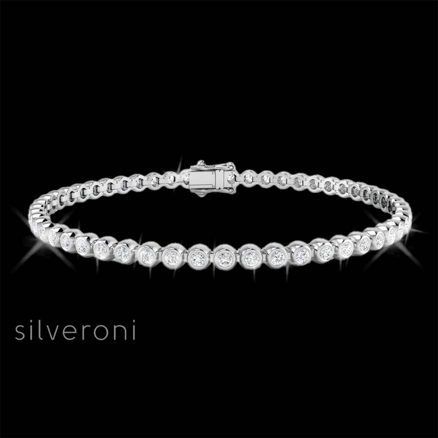 2 carat lab diamond bracelet, bezel set lab diamond, ethical tennis bracelet, round cut diamond jewelry, lab-grown brilliance, white gold diamond bracelet, Silveroni luxury, minimalist jewelry trend, D color VVS diamond, handcrafted in Thailand