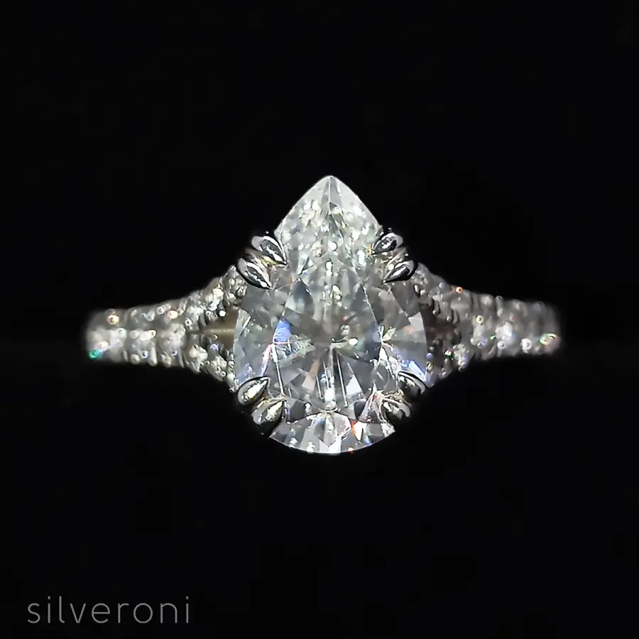 The Majestic Luster Lab Grown Diamond Solitaire is the ultimate expression of sophistication and grace. At the heart of this masterpiece sits a 2.0 carat pear cut lab-grown diamond, known for its teardrop shape and captivating sparkle. Surrounding the center, 22 round cut diamonds—totaling 1.0 carat—add graceful accents of brilliance, completing this elegant 3.0 carat ensemble. This ring is designed for those who seek timeless style with a modern, ethical twist.
