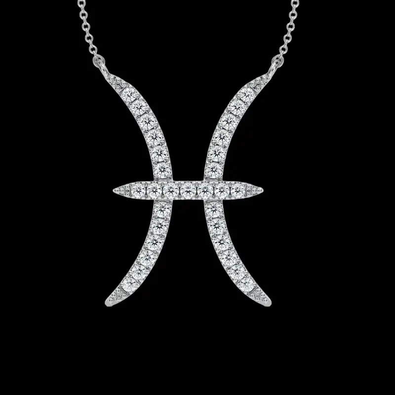 The Pisces symbol, resembling flowing fish or waves, is represented with soft curves that evoke a sense of continuous motion and emotional fluidity. Each diamond captures and refracts light in a way that mirrors the Piscean’s boundless imagination and delicate heart. The polished 18K white gold frame enhances this effect, offering a luminous backdrop that balances elegance with resilience.