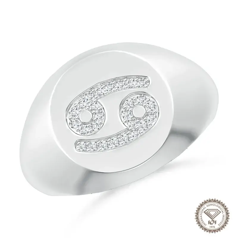 Front and center, the Cancer glyph is sculpted with gentle curves, symbolizing loyalty, home, and intuition. Encircling it, pavé diamonds create a halo of light that mirrors moonlight on water—subtle yet radiant. The 18K white gold band is polished to perfection, edges smoothed for comfort, delivering both durability and grace.
