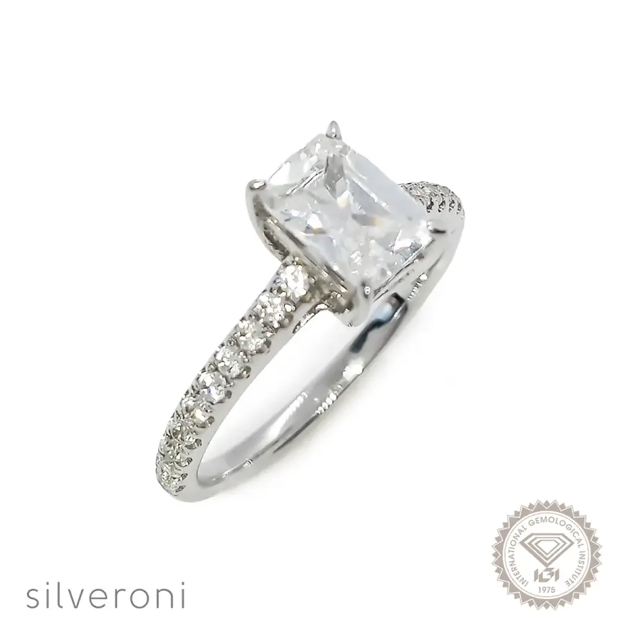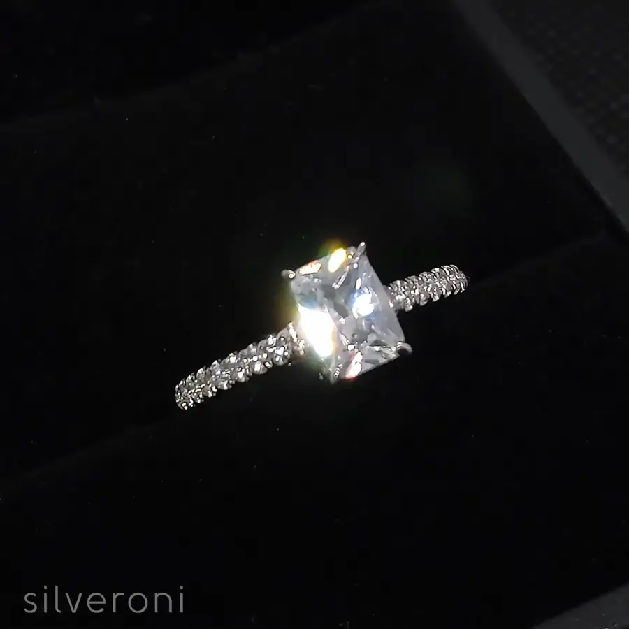 The Sleek Emerald Solitaire Lab Grown Diamond Ring by Silveroni presents a sophisticated design which unites geometric precision with soft diamond sparkle and modern sustainability. The ring is designed for someone who wants elegant style with purpose.