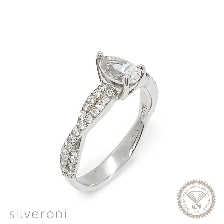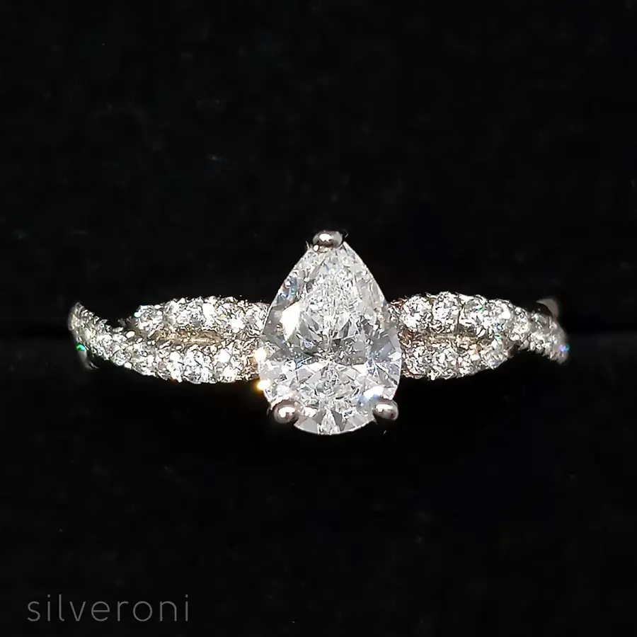 This exceptional design centers on a mesmerizing pear-cut lab grown diamond, sized at 7.0 x 5.0 mm with a weight of 0.65 carats. The pear cut, often called the teardrop diamond, elegantly elongates the finger while playing with light in ways that only this unique shape can.