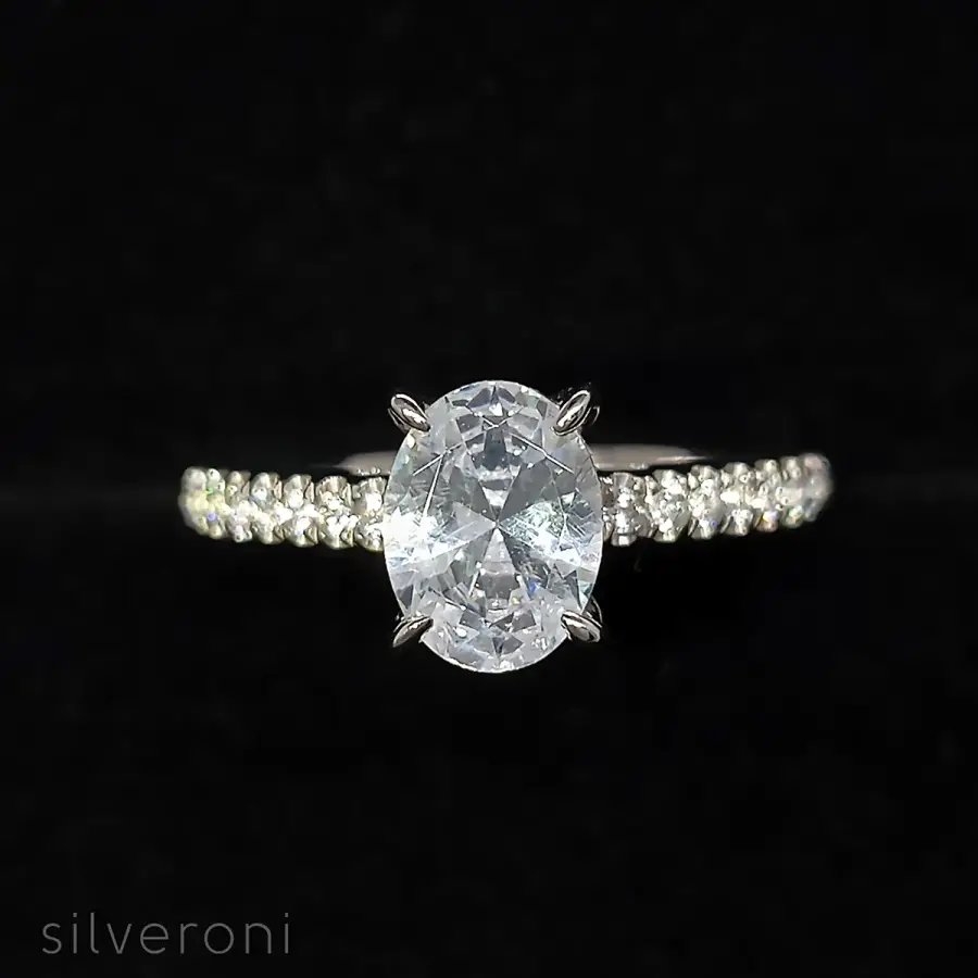 Center of this ring showcases 1.35 carats of lab grown diamonds. A large oval diamond measuring 8.0 x 6.0 mm stands at the ring's center and two rows of 20 small 1.4 mm accent stones frame it. The selection process for stones focused on VS clarity standards to achieve maximum brilliance with minimal inclusions.